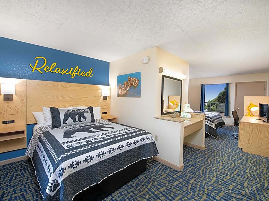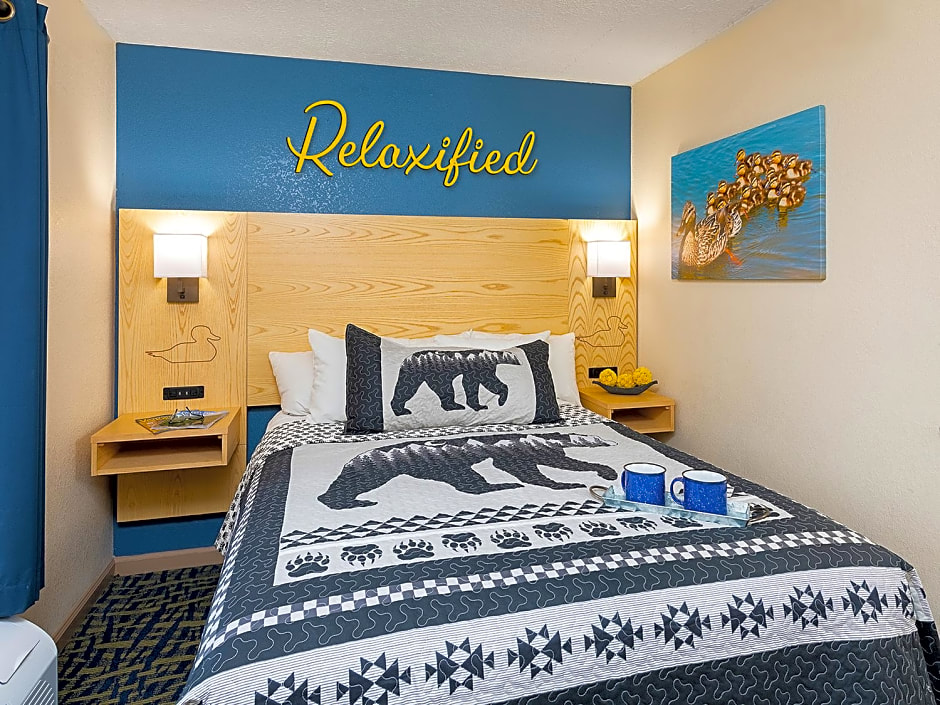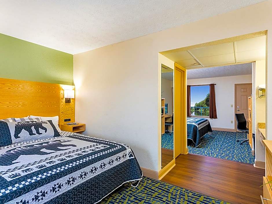 This room features a private balcony overlooking the Little Pigeon River. A kitchenette and 2 televisions are also included; 1 TV on each side of the room. Please note this room is located in Building 2, which is near the campground across the river from Building 1. Enjoy a relaxing stay in this spacious room featuring a private balcony with stunning views of the Little Pigeon River. The room includes a convenient kitchenette equipped with a refrigerator, stovetop, microwave, and kitchenware, perfect for preparing meals. Two televisions—one on each side of the room—add to the comfort and convenience. Located in Building 2, near the campground across the river from Building 1, this room is perfect for up to four guests, offering a cozy retreat with both river views and modern amenities.